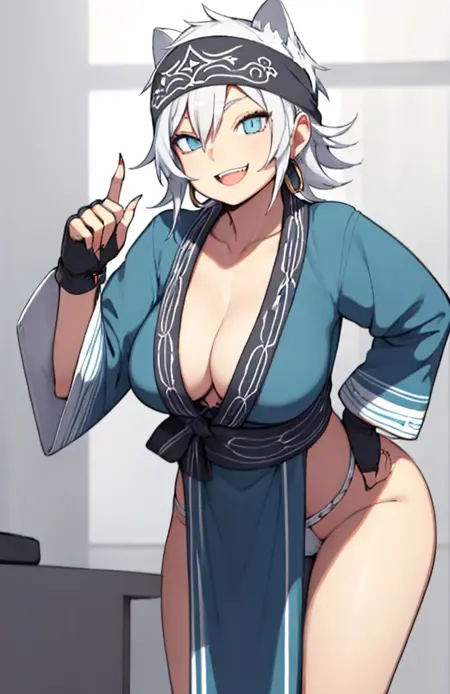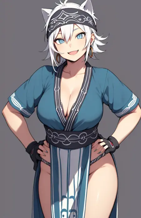 Makutasa, light eyes, white hair, slit pupils, animal ears, short hair, fluffy hair, hair between eyes, large breasts, sharp nails, detailed face, hoop earrings, fang,