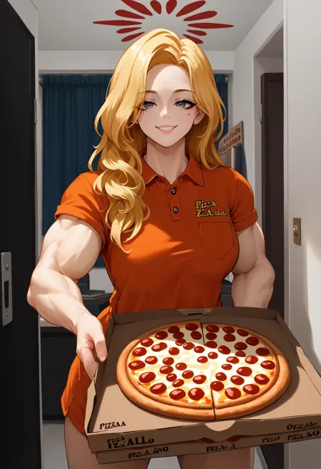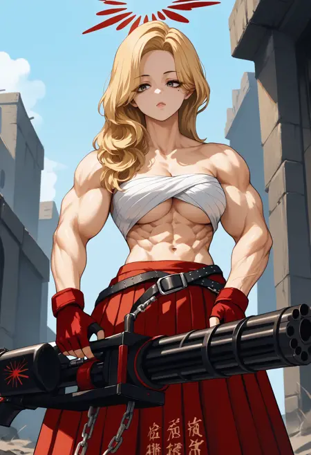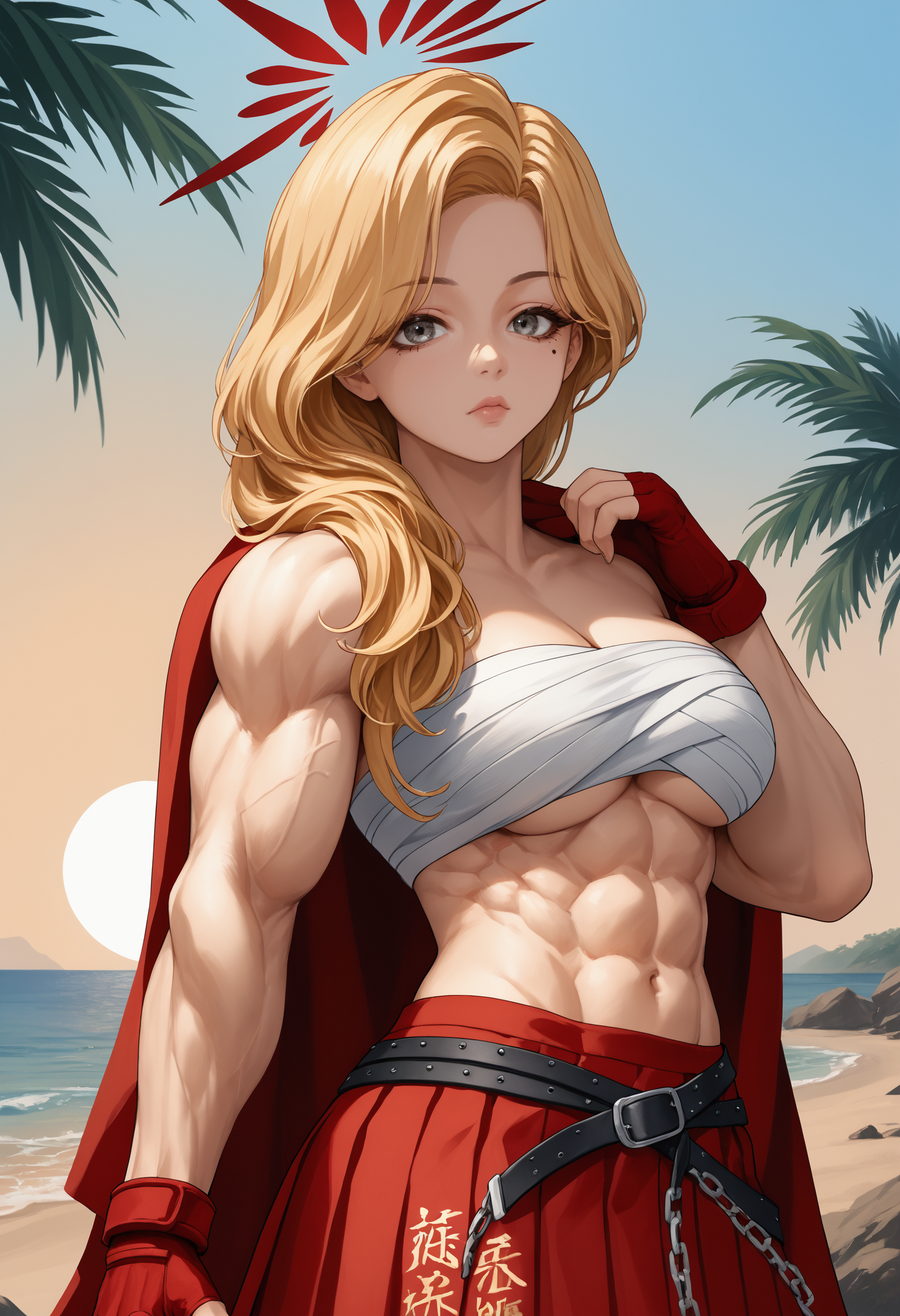 常に必要: "akekur, grey eyes, blonde hair, long hair, mole under eye, red halo, large breasts, muscular female"