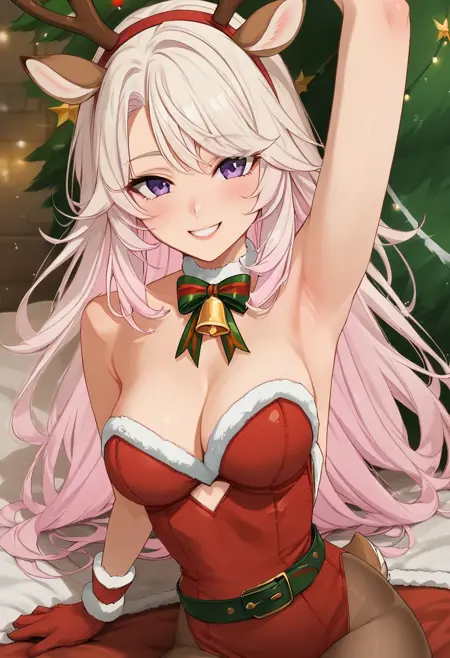 lillia_awakened, lillia_christmas, 1girl,solo, breasts, gloves, animal ears, pantyhose, long hair, deer ears, christmas, belt, purple eyes, bell, fur trim, red gloves, dress, cleavage, antlers, red dress, alternate costume, white hair, multicolored hair, pink hair, reindeer antlers, bow, fur-trimmed dress, bangs