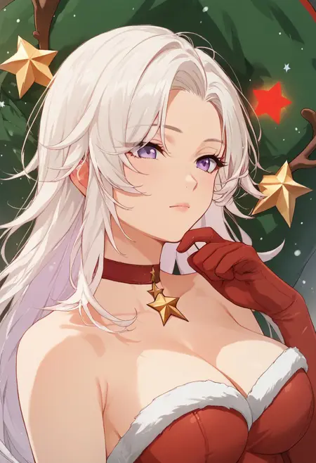 lillia_awakened, lillia_christmas, 1girl, solo, gloves, purple eyes, pantyhose, leotard, christmas, white hair, multicolored hair, pink hair, breasts, red leotard, elbow gloves, red gloves, long hair, cleavage, strapless, high heels, covered navel, strapless leotard, choker, red footwear, bare shoulders, star (symbol),