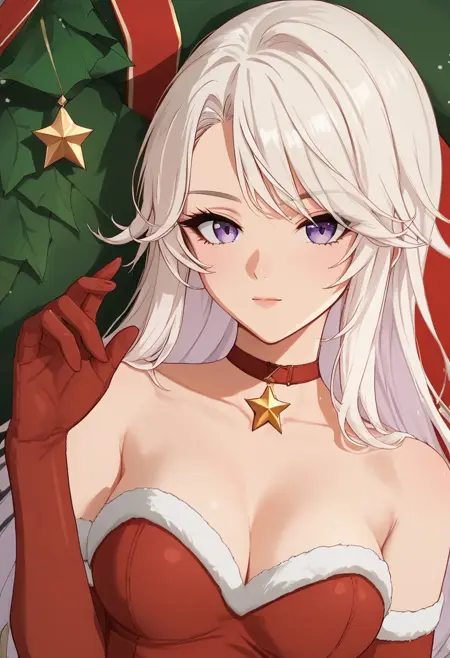 lillia_awakened, lillia_christmas, 1girl, solo, gloves,purple eyes, pantyhose, leotard, christmas, white hair, multicolored hair, pink hair, breasts, red leotard, elbow gloves, red gloves,long hair, cleavage, strapless, high heels, covered navel, strapless leotard, choker, red footwear, bare shoulders, star (symbol),