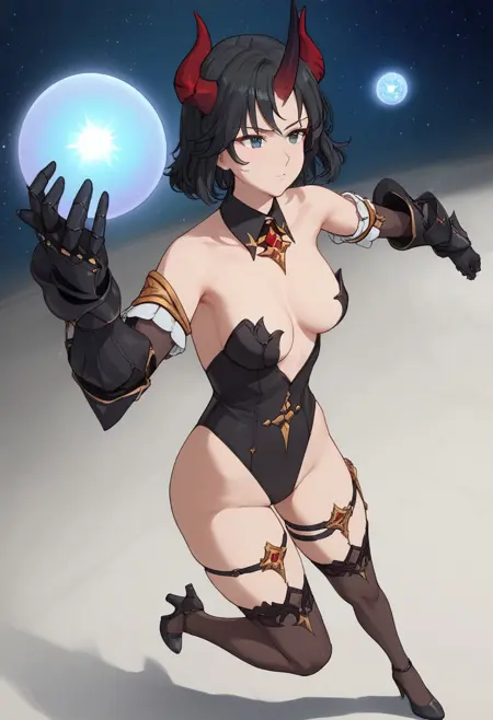 lillia_mastermind, lillia_blue_ur, alternate costume, 1girl, ((horns)), black hair, short hair, black blue eyes, single horn, breasts, medium breasts, strapless, gauntlets, detached collar, leotard, black leotard, thighhighs, thigh strap, elbow gloves, black gloves, gloves, black footwear, high heels, cape,