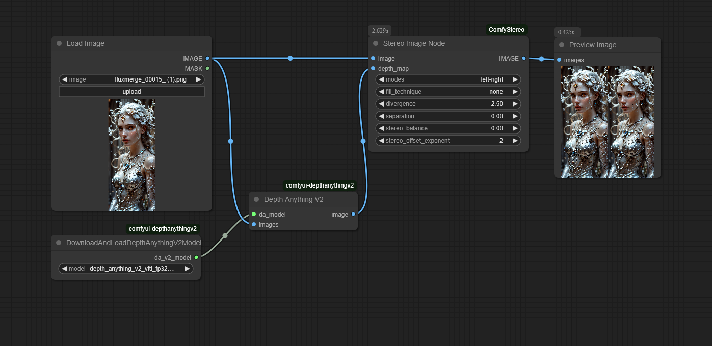 - Stereo Image Node – Automatic1111 스테레오 스크립트를 포팅한 것으로, 깊이 맵의 에지 인식 및 방향 인식 블러링과 같은 추가 기능이 포함되어 있습니다. 노드에서 좌우, 교차 시야, 애나글리프 모드를 사용할 수 있습니다.