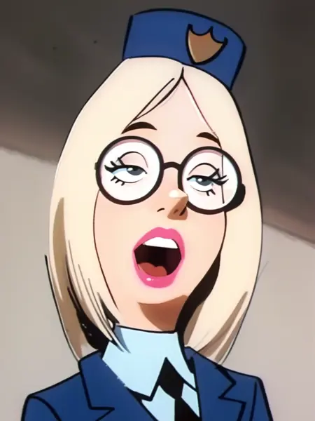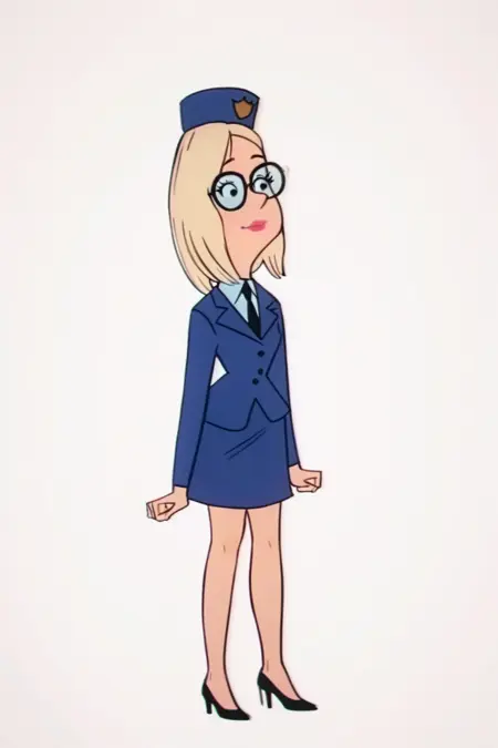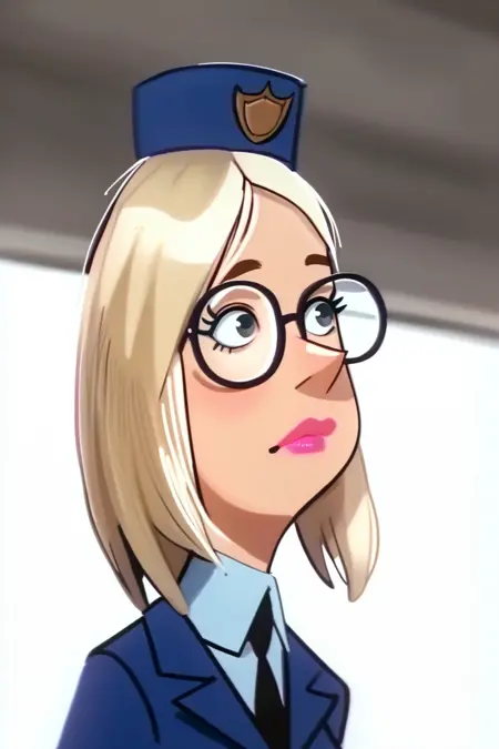 rosemary, blonde hair, glasses, pink lips, office uniform, black necktie, pencil skirt, police hat, high heels