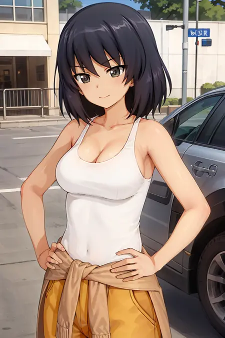 호시노 메인 옷장 태그: 화이트 탱크톱, 볼륨감 있는 가슴, 점프수트, 허리 부근 옷, 검은 샌들, 신발