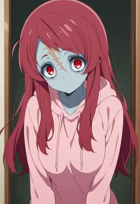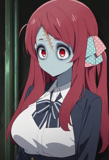 1girl, solo, red eyes, red hair, long hair, zombie form, blue skin, scar on forehead, school uniform, polka dot bow, hair bow, white shirt, collared shirt, bowtie, black jacket, open jacket, long sleeves, white skirt, white socks, loafers, bandaged leg,