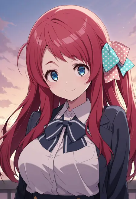 1girl, solo, blue eyes, red hair, long hair, school uniform, polka dot bow, hair bow, white shirt, collared shirt, bowtie, black jacket, open jacket, long sleeves, white skirt, white socks, loafers,
