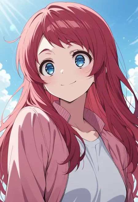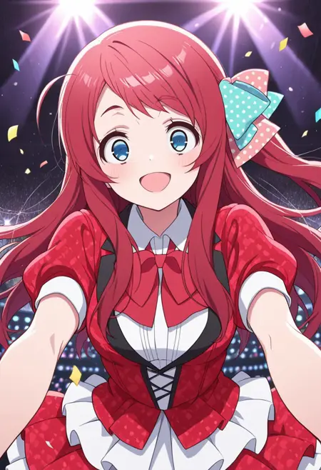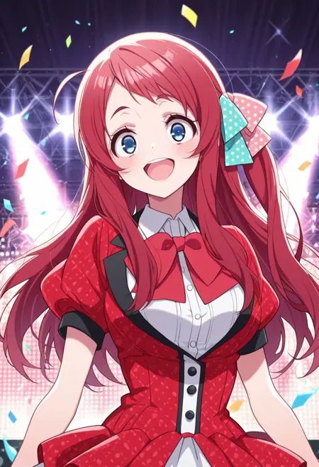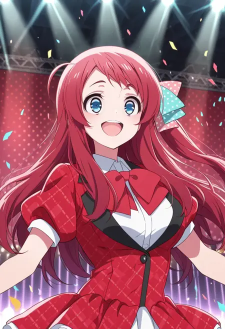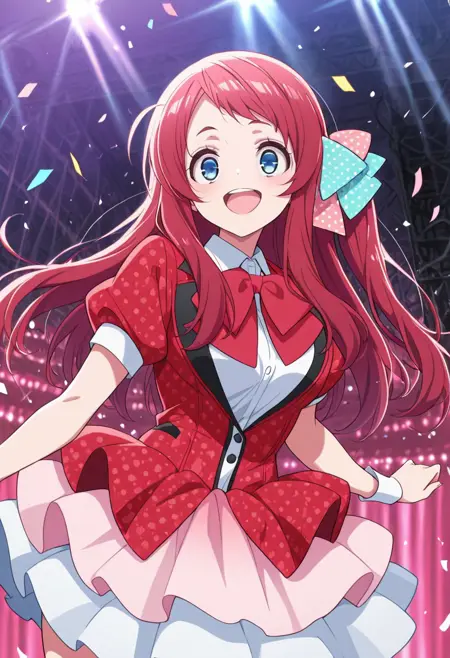 1girl, 单人, 蓝眼, 红发, 长发, 偶像装, 波点发结, 发饰, 白色衬衫, 有领衬衫, 红色蝴蝶结, 红色夹克, 蓬松短袖, 白色手套, 粉色裙子, 靴子,
