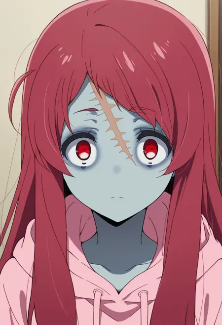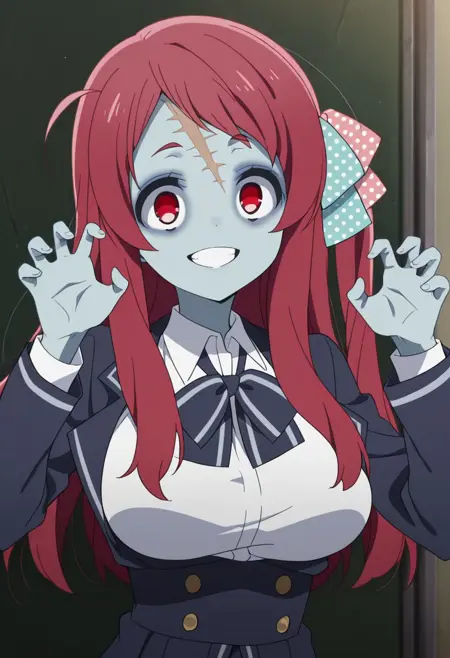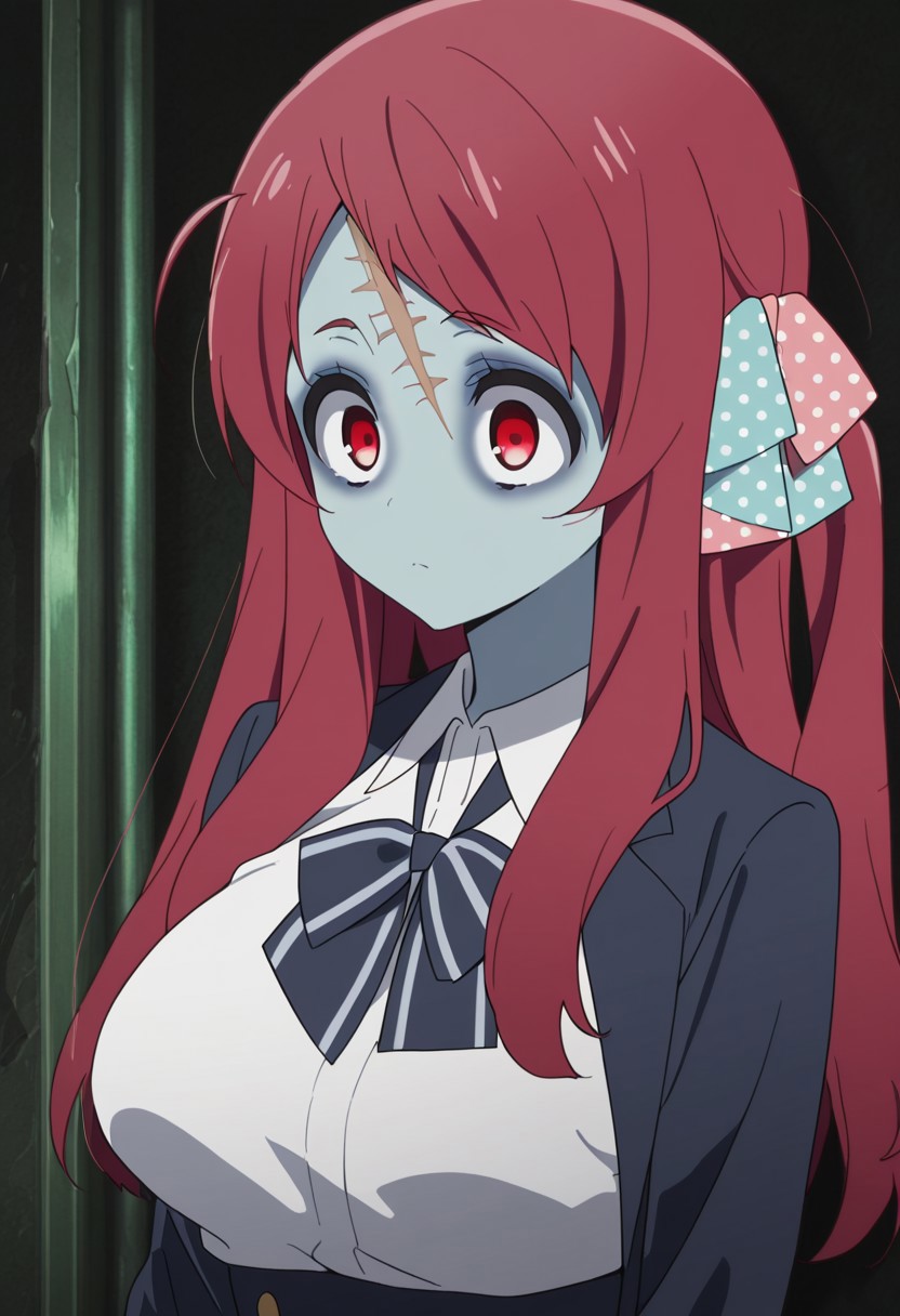 1girl, 单人, 红眼, 红发, 长发, 尸体形态, 蓝色皮肤, 额头伤疤, 校服, 波点发结, 发饰, 白色衬衫, 有领衬衫, 蝴蝶结, 黑色夹克, 开襟夹克, 长袖, 白色裙子, 白袜, 乐福鞋, 绷带腿,