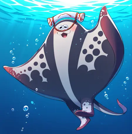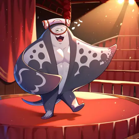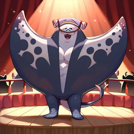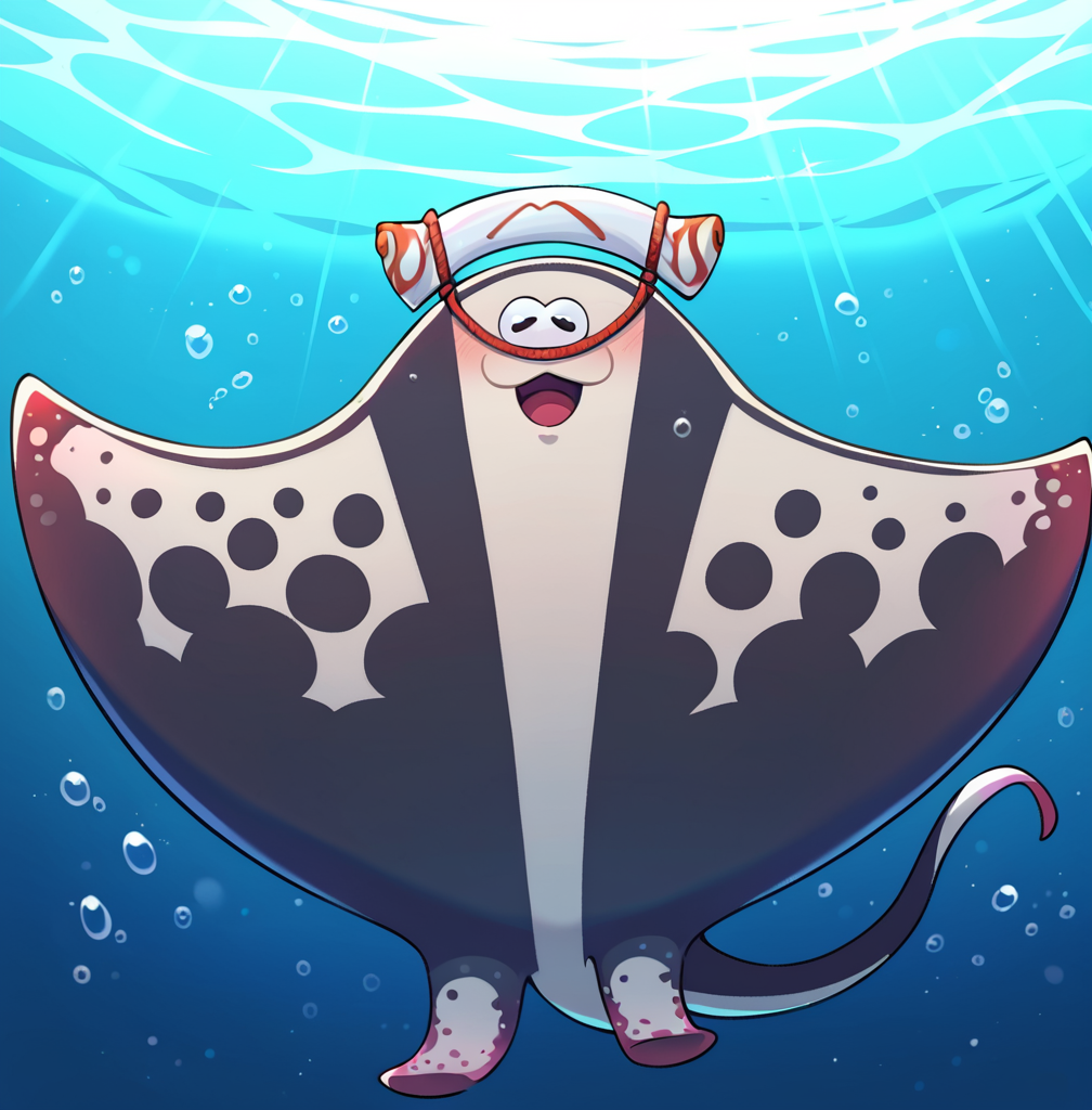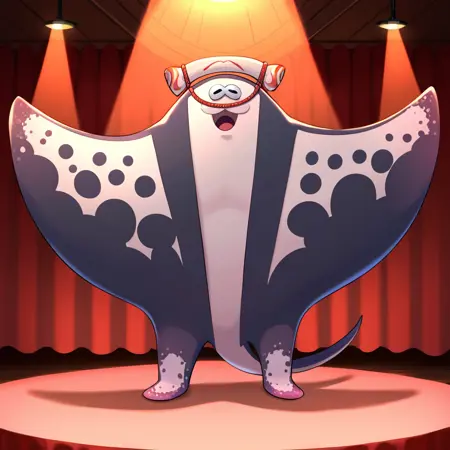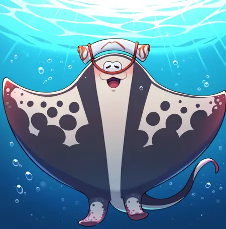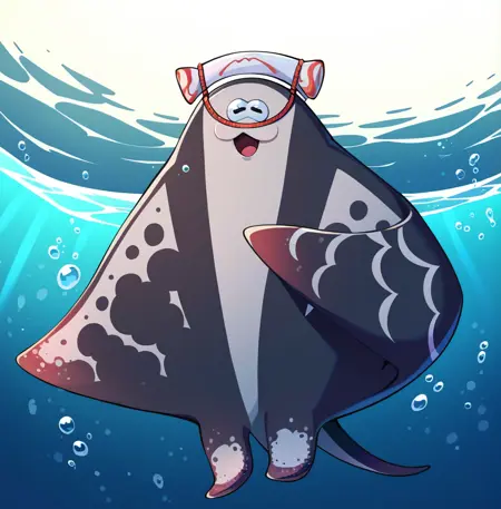 Best Positive Input: (big man, splatoon, manta ray, dark grey and light grey body, fins, headwear, cute face, :3)