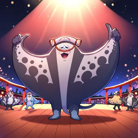 最適なポジティブ入力: (大きい男、スプラトゥーン、マンタレイ、濃いグレーと薄いグレーの体、ヒレ、頭部装飾、かわいい顔、:3)