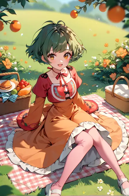 long dress, orange dress, multi colored dress, orange long sleeves, (wide sleeves:0.6), neck ribbon, waist ribbon, red camisole, pink pantyhose, white footwear,