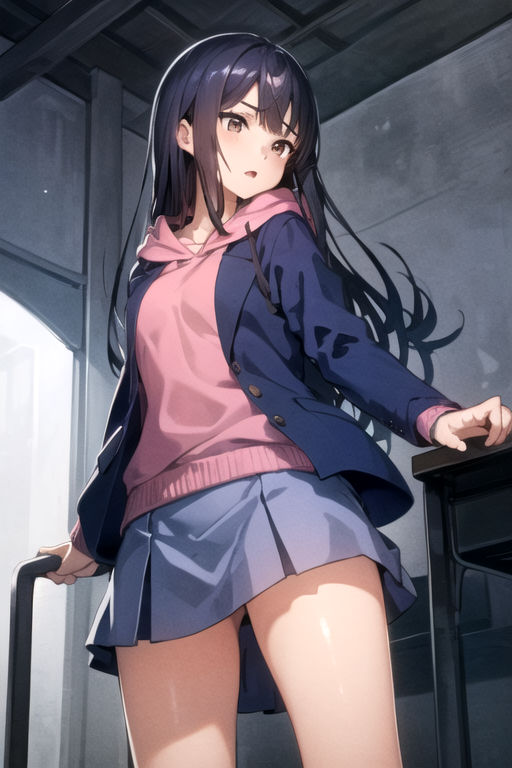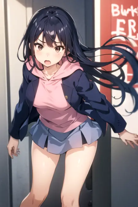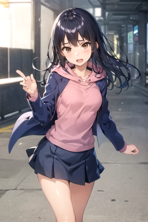 KurebayashiYuzuki, 1girl, solo, long hair, miniskirt, black hair, brown eyes, blue jacket, pink hoodie