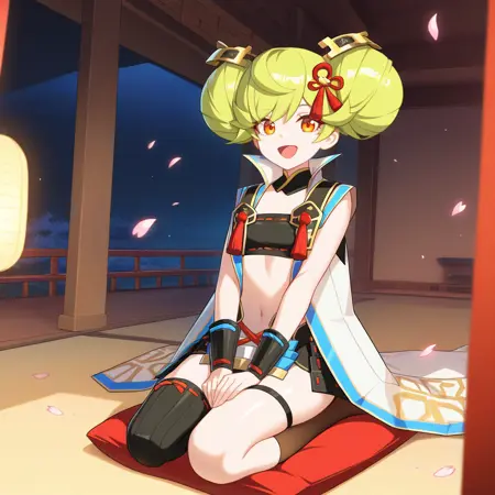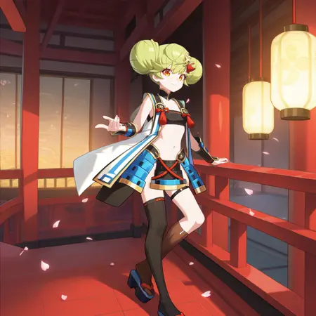 AichanHi3, Aic_JP, 녹색 머리카락, 머리 뾰족이, 더블 뾰족이, 주황색 눈, 튜브 탑, 검은 튜브 탑, 갑옷 스커트, 미니스커트, 검은 스커트, 일본 갑옷, 손목 보호대, 파랑 장식, 흰색 재킷, 열린 재킷, 어깨 없는 재킷, 높은 칼라, 분리형 칼라, 배꼽, 복부, 머리 장식, 일본 옷, 주름진 허벅지 양말, 한쪽 허벅지 양말, 불일치하는 하의, 검은 허벅지 양말, 검은 허벅지 끈, 십자 끈, 머리 리본, 한쪽 무릎 양말, 갈색 무릎 양말, 스톨, 흰색 스톨, 붉은 덩어리,