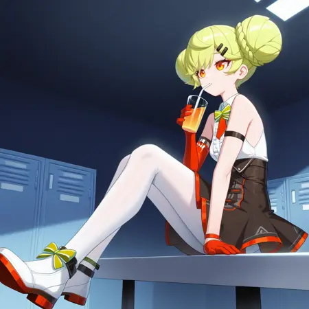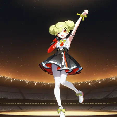 AichanHi3, Aic_Idl, 녹색 머리카락, 머리 뾰족이, 더블 뾰족이, 주황색 눈, 어깨 없는 셔츠, 주름진 셔츠, 중앙 주름, 칼라 셔츠, 녹색 활, 넥타이, 빨간 넥타이, 허리 높은 스커트, 검은 스커트, 주름진 스커트, 줄무늬, 의상 절개, 드러난 어깨, 한쪽 팔꿈치 장갑, 빨간 장갑, 비대칭 장갑, 부분 손가락 없는 장갑, 팔 끈, 헤어클립, 땋은 머리, 흰색 팬티스타킹, 손목 끈,
