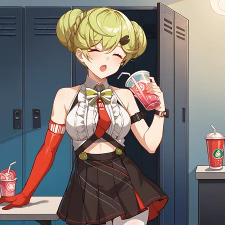 Cab_Alt, 长手套, 单手套, 白色连裤袜, 编发发髻, 红色手套, 不对称手套, 不搭配手套, 臂环, 衣物开孔, 替代短款上衣, 无袖衬衫, 编发, 替代白色衬衫, 褶边衬衫, 有领衬衫, 替代绿色领结, 红色领带, 高腰裙, 黑色裙子, 百褶裙, 发夹, 黑色绑带,