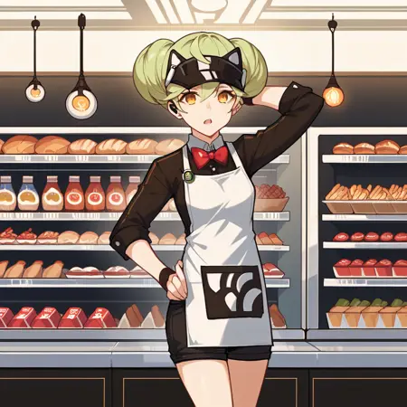 AichanHi3, Aic_Shp, 绿发, 发髻, 双发髻, 橙色眼睛, 黑色头饰, 遮阳帽, 假动物耳朵, 耳机, 棒球衫, 白色衣领, 红色领结, 白色围裙, 印花围裙, 白色腰带, 条纹短裤, 黑色短裤, 黑色衬衫, 袖子卷起, 白色袖口, 黑色袖子, 黑色腕带, 白色膝上袜,