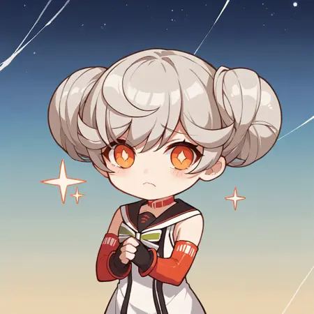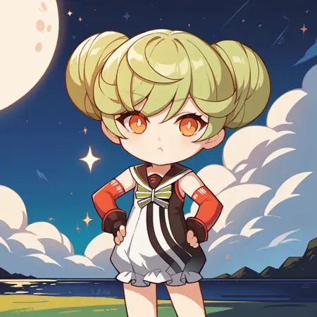 Cab_Chib, Q版, 橙色眼睛, 双发髻, 短发, 发髻, 领结, 水手领, 白色连衣裙, 褶边连衣裙, 分离袖, 红色袖子, 黑色手套, 无指手套, 无袖连衣裙, 连衣裙, 条纹蝴蝶结, 黑色过膝袜,