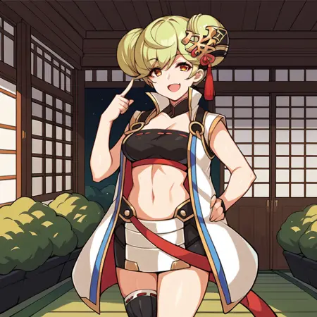 AichanHi3, Aic_JP, 绿发, 发髻, 双发髻, 橙色眼睛, 管状上衣, 黑色管状上衣, 铠甲裙, 迷你裙, 黑色裙子, 日本铠甲, 手腕护具, 蓝色镶边, 白色夹克, 开襟夹克, 无袖夹克, 高领, 分离衣领, 肚脐, 腰部, 发饰, 日本服饰, 纹理过膝袜, 单条过膝袜, 不搭配的裤袜, 黑色过膝袜, 黑色大腿绑带, 交叉绑带, 发带, 单条膝上袜, 棕色膝上袜, 披肩, 白色披肩, 红色流苏,