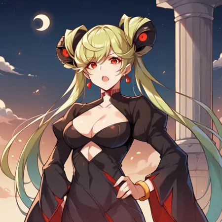 AichanHi3, Aic_Evl, 绿发, 发髻, 双发髻, 长发, 红色眼睛, 紧身连衣裙, 长裙, 黑色连衣裙, 长款连衣裙, 红色镶边, 暗黑人格, 红色项圈, 头饰, 朱丽叶袖, 深V领, 胸部露出, 锁骨, 黑色袖子, 宽袖, 金色手镯, 双马尾, 发圈, 发带, 白色丝带, 金色耳环,