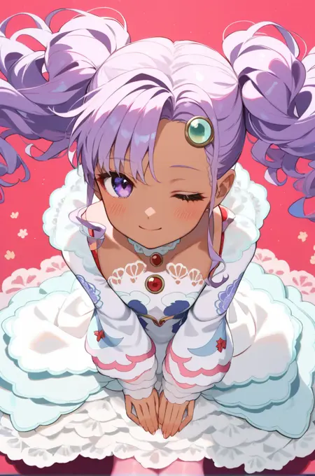 meredyceles, purple hair, twintails, purple eyes, dark skin, wavy hair, sidelocks, long hair,