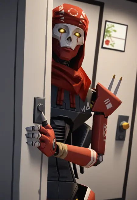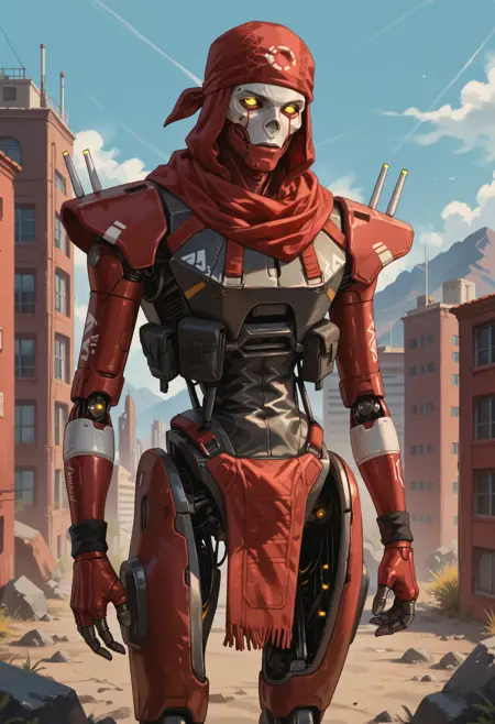 Reinforcement tags: humanoid robot, red bandana, robot, red scarf, yellow eyes, black sclera