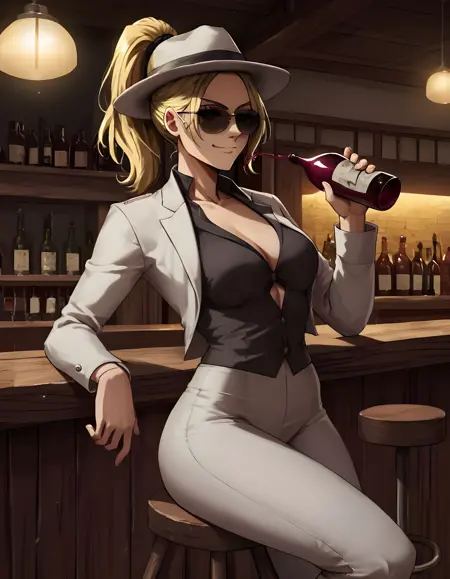 white_fedora —— 她外出时佩戴的帽子,同时搭配 white_blazer, black_shirt, white_pants, black_heel_shoes
