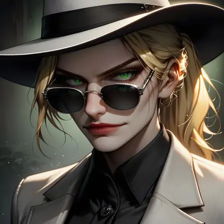 white_fedora – 外出時に着用するベスの帽子。white_blazer, black_shirt, white_pants, black_heel_shoesと合わせて着用
