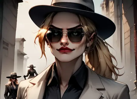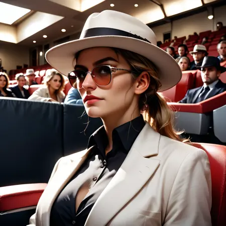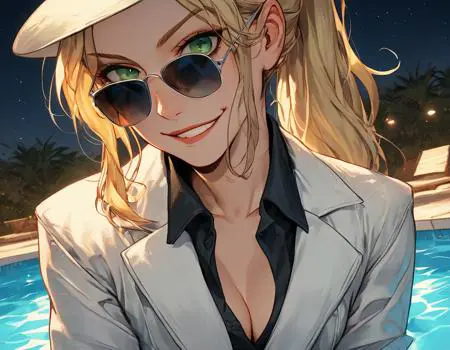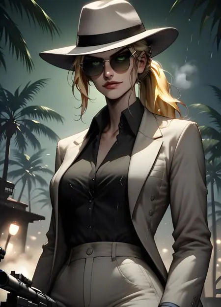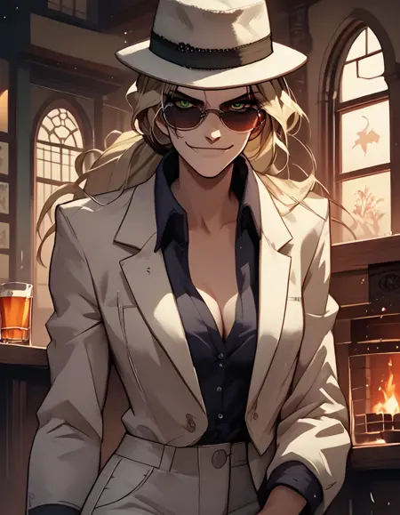 white_fedora —— 她外出时佩戴的帽子,同时搭配 white_blazer, black_shirt, white_pants, black_heel_shoes