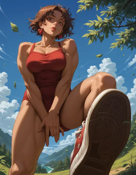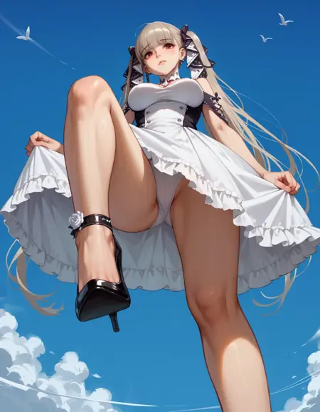 Other keywords: standing on one leg, boots, blurry, dynamic pose, arms up, adjusting hair