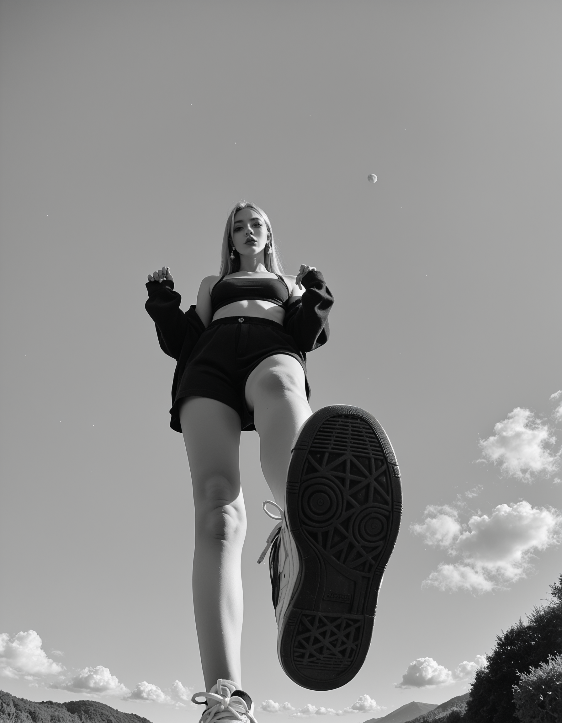 OUTDOORS: hud_v4nspose, sneakers, shoe soles, from below, solo, sky, cloud, foreshortening, perspective, outdoors, torn clothes, torn jeans,