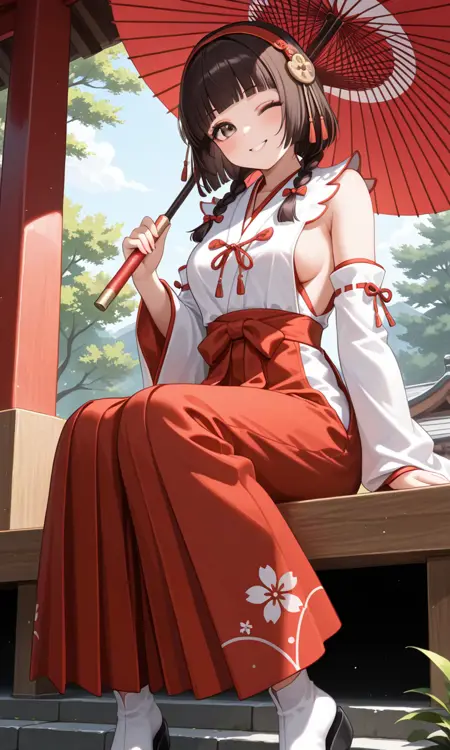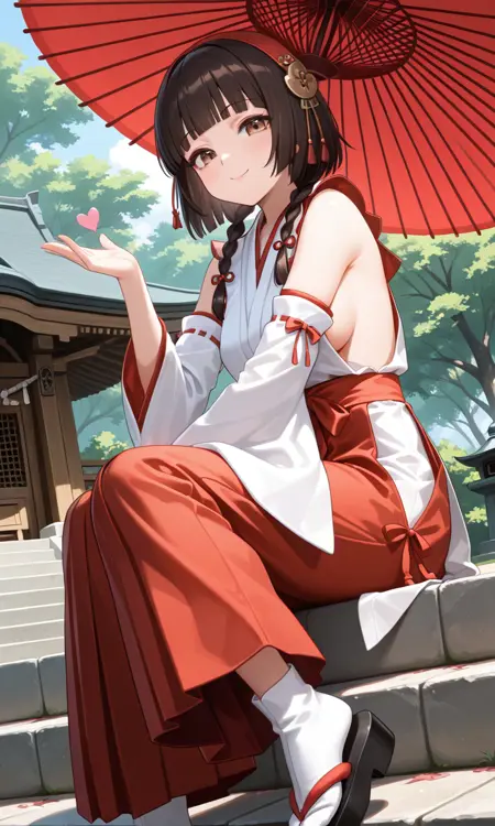 Okuni, black short hair, hair ornament, clear brown eyes, hairband, detached sleeves, bare shoulder, japanese clothes, white kimono, wide sleeves, red hakama, tabi, blunt bangs, twin braids, hair over shoulder, sideboob, parasol