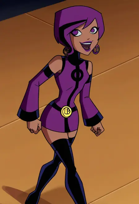 General prompts for the Purple Single version: DDamsel, dark skin, PDuo, purple eyes, purple hair, short hair, makeup, purple lips, purple hoop earrings, short dress, purple dress, detached sleeves, gold buckle on belt, belt, zettai ryouiki, black thighhighs, black thigh boots,