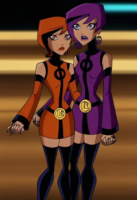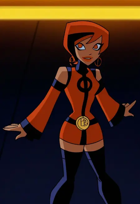 Luornu Durgo aka Duo Damsel from the Season 2 of the Legion of Superheroes animated show. Includes the Merged Duo, Orange Single, and Purple Single costumes.