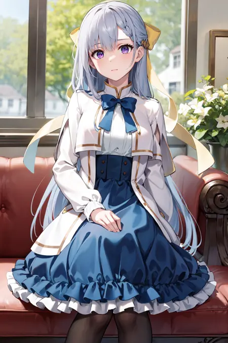 white coat, white capelet, white shirt, blue bowtie, blue corset, blue skirt, high-waist skirt, frilled skirt, pantyhose, high heels