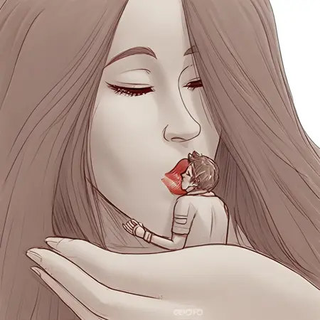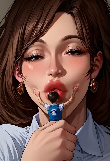 컨셉: 거대한 여성이 남성의 얼굴을 키스하는 장면