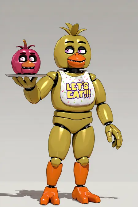 ChicaFNAF1, 1girl, animatronic chicken, yellowish body, orange beak, magenta eyes, bib, black eyebrows, three tufts on head, two talons from each orange feet, robot joints, chica (fnaf)