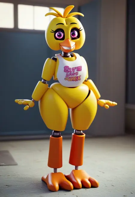 chica, solo, looking at viewer, smile, 1girl, standing, full body, teeth, english text, robot, bright yellow fur, chicken, magenta eyes, black eyebrows, white bib, big beak