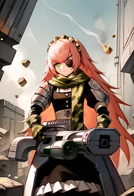 Default Outfit: maid headdress, eyepatch, camouflage, frills, armor, black dress, puffy long sleeves, green gloves, green scarf