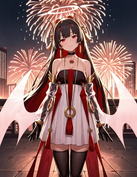 evg_dress, evg_hair_ornament, evg_fake_animal_ears, evg_fake_horns, evg_elbow_gloves, evg_armlet, evg_detached_sleeves, 透けている袖, evg_thighhighs, evg_halo, evg_energy_wings, evg_earrings, evg_choker, evg_necklace, ステッピングレッグウェア, evg_tassel, evg_high_heels, ステッピングレッグウェア