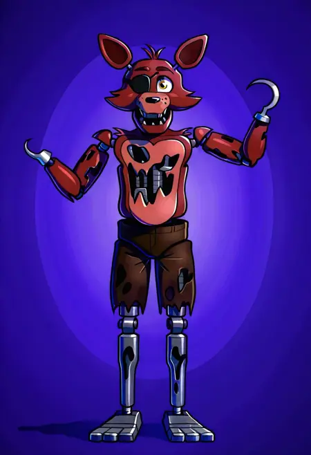 | 训练词汇 | FoxyFNAF, 1boy, large animatronic fox, crimson tattered fur, yellow eyes, red eyebrows, three strands of hair from the top of head, hook for right hand, eye patch that is folded over right eye, brown shorts, torn pants, damaged, robot joints, gray robotic legs已复制! |