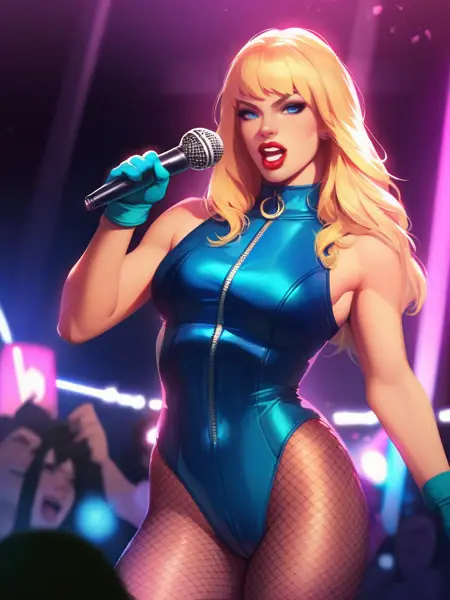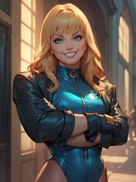 プロンプト: ディナ、ロングヘア、ブロンドヘア、青い目、前髪、レオタード、短めのジャケット、レザージャケット、フィッシュネットタイツ、手袋、膝上ブーツ、