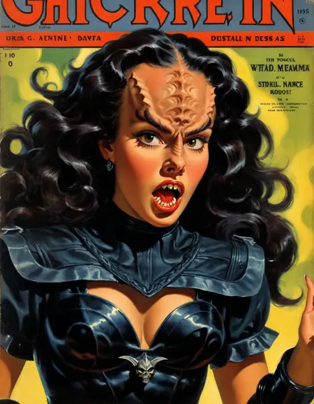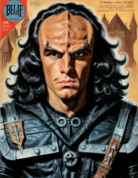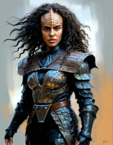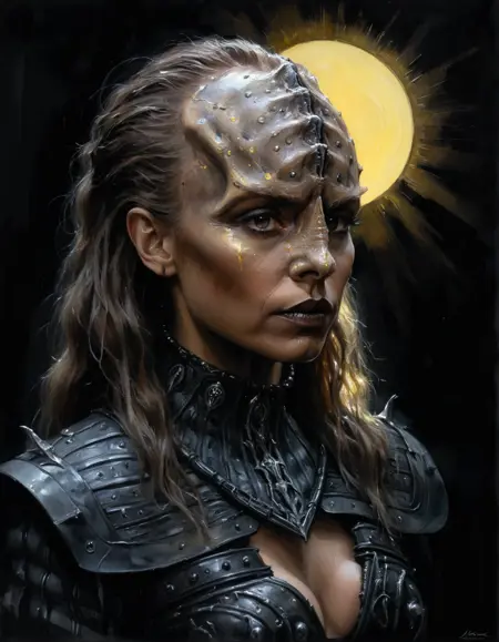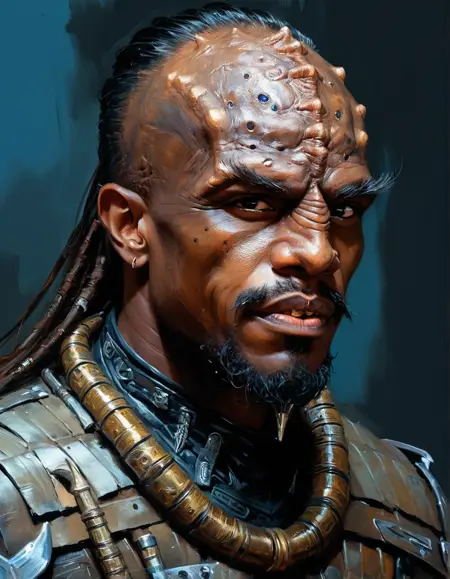 プロンプトの良い開始文: {female or male} kling0n alien, forehead ridges, brown skin, nose ridges, wide nose, large eyebrows, curly wavy black hair