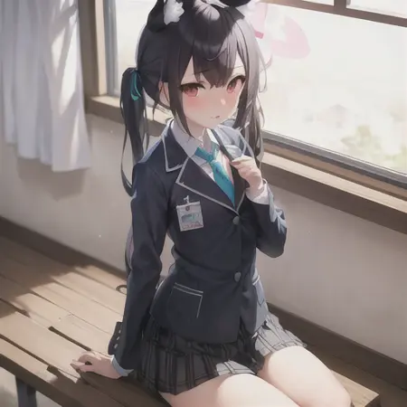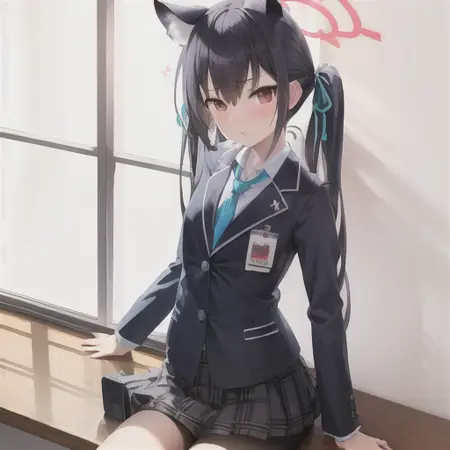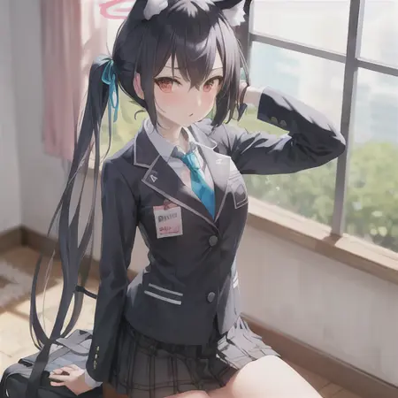 1girl, serika, twintails, school uniform, skirt, cat ears, jacket, necktie, cat ears, animal ear fluff, halo