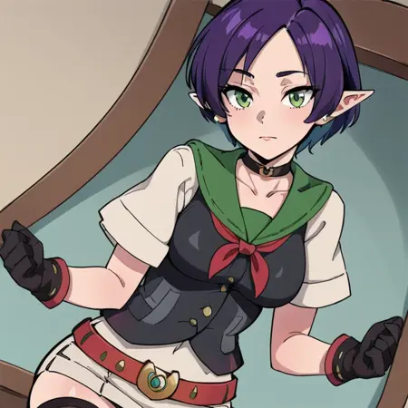 1girl,solo,breasts,short hair,skirt,thighhighs,gloves,jewelry,medium breasts,green eyes,purple hair,short sleeves,earrings,choker,pointy ears,belt,vest