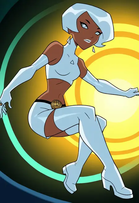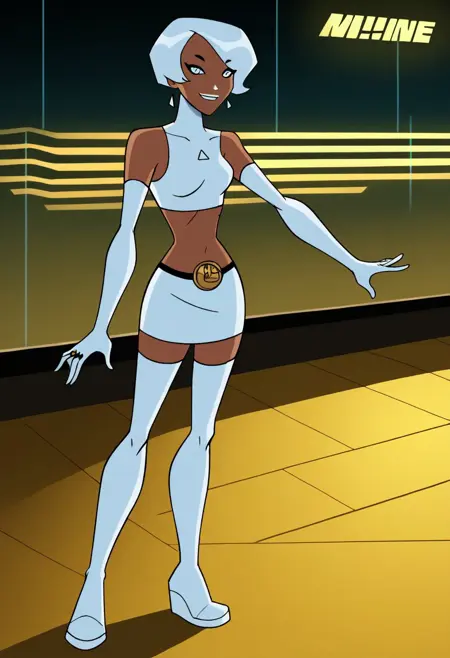 화이트 싱글 버전용 일반 프롬프트: TriG, 검은 피부, WTG, 흰 머리, 단발, 흰 눈, 흰 입술, 흰 귀걸이, 메이크업, 흰 크롭탑, 흰 팔꿈치 장갑, 벨트, 벨트 금색 버클, 허리, 흰 스커트, 미니스커트, 흰 허벅지 양말, 흰 부츠, 금색 반지, 젯타이 르욘기,