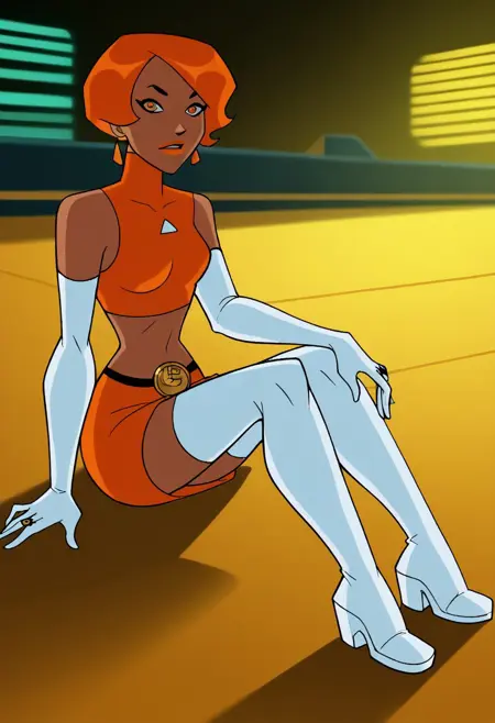 오렌지 싱글 버전용 일반 프롬프트: TriG, 검은 피부, OTG, 오렌지 머리, 단발, 오렌지 눈, 오렌지 입술, 오렌지 귀걸이, 메이크업, 오렌지 크롭탑, 흰 팔꿈치 장갑, 벨트, 벨트 금색 버클, 허리, 오렌지 스커트, 미니스커트, 흰 허벅지 양말, 흰 부츠, 금색 반지, 젯타이 르욘기,