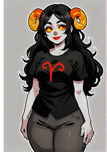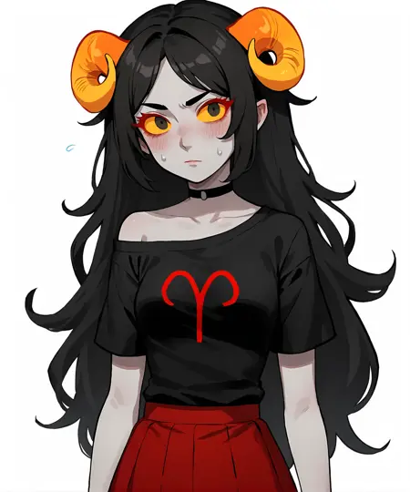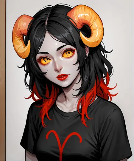 情境提示词:黄色眼白、白色眼白、黑色眼睛、红色眼睛、无瞳孔、彩色皮肤、灰色皮肤、绵羊角、长发、黑发、黑色上衣、T恤、长裙