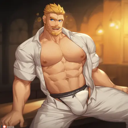 Cyrus, bara, muscular male, blue eyes, facial hair ,beard, mustache, blond hair,short hair,