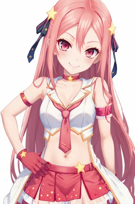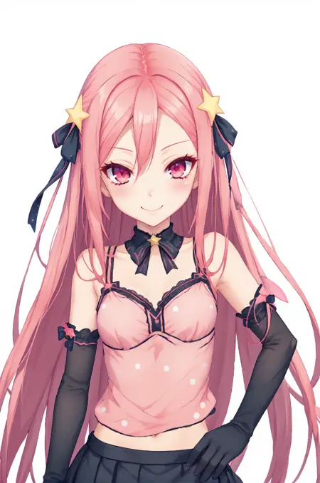 main : mainSet, black elbow gloves, black skirt, black leg warmers, star (symbol) hair ribbon, detached sleeves, lace trim, ribbon, polka dot, pink camisole, midriff